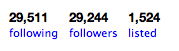 Before: 40k following and 45k followers.During: all over the map: many as 17,000 cut from follower AND following listsAfter: 24.7k following and 40k followers.